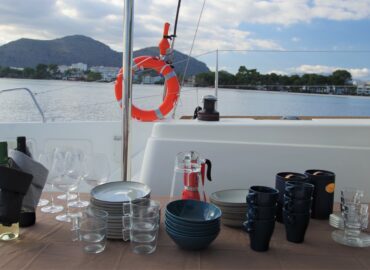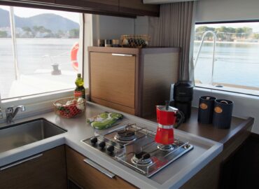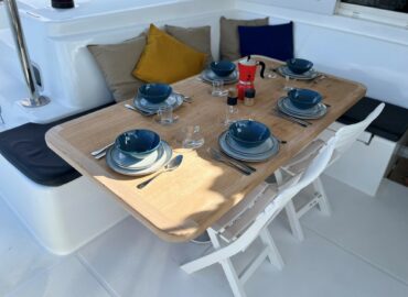 Dining table to accomodations up ten guests and there is a recreation area. The galley is organised with all the amenities: hob, oven, stainless steel sink, and ample stowage.